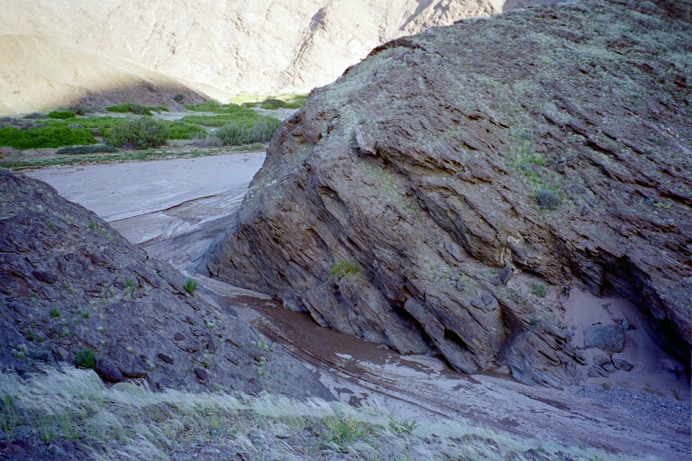 Dann ging es weiter über Sesfontein, hier haben wir einen Rock Shandy getrunken, zu Dirks Camp. Wir sind erst ein Stück Straße gefahren und dann durch ein Flussbett. Auf der Fahrt zum Camp haben wir Holz zum Grillen auf den Anhänger gelegt. Naja dann ging es eine Düne rauf und runter, tja und da passierte es. Das Holz rutschte in die Heckscheibe. Am Camp angekommen, haben wir uns erstmal mit einem Drink bewaffnet und uns in einem Felsvorsprung in den Schatten verzogen. Camp ist eigentlich zuviel gesagt. Eine Feuerstelle, eine Bank und eine "Toilette". Aber traumhaft schön mitten in der Wildnis. Und wir waren wieder ganz alleine.