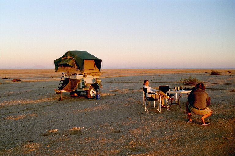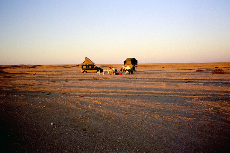 Dann sind wir weiter über Uis, hier haben wir nochmal getankt, in Richtung Hentiesbay. Da so langsam die Sonne unterging, sind wir von der Straße runter, ca. drei Kilometer rechts rein und haben im Nichts unser Zelt aufgebaut.