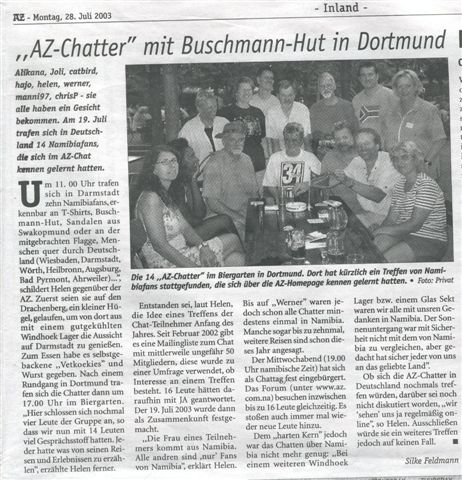 Am 19. Juli 2003 war es dann soweit. Um 11 Uhr trafen sich in Darmstadt 10 Namibiafans, erkennbar an T-Shirt, Bushman-Hut, Sandalen aus Swakopmund oder an der mitgebrachten Flagge:-)